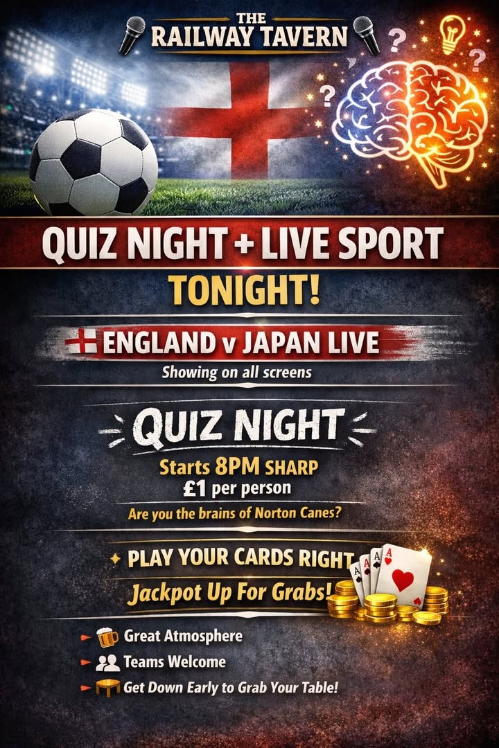 TONIGHT AT THE RAILWAY TAVERN 🇬🇧⚽🧠 It’s a BIG one tonight… 🏉 England v Japan LIVE on the screens 🕗 Quiz Night kicks off at 8PM sharp 💷 Just £1 per person to play Think you’ve got the brains of Norton Canes? 🧠 Get your team together and prove it! And don’t forget… 🃏 Play Your Cards Right after the quiz 💰 Jackpot waiting to be won! Great atmosphere, great laughs & a proper midweek night out 🍻 👉 Get down early, grab your seats & don’t miss it!