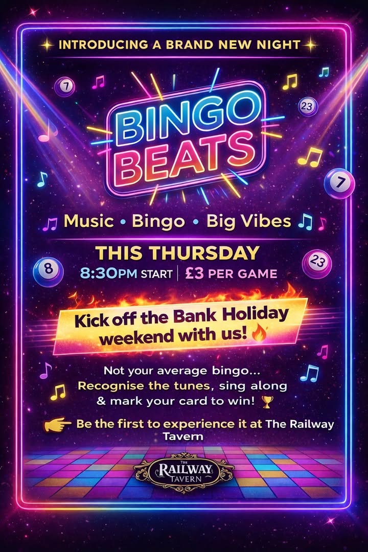🎶🔥 INTRODUCING BINGO BEATS – THIS THURSDAY! 🔥🎶 We’re bringing something BRAND NEW to The Railway Tavern… 👀 Kick off the Bank Holiday weekend with us 🍻 🕗 8:30PM START 🎟️ £3 per game Not your usual bingo… 🎧 It’s all about the music 🎤 Sing it, know it, mark it 🏆 Win it Be the first to experience it at the Tavern! 👉 Tag your mates & get them down – let’s make it a big one 💃🔥 #RailwayTavern #BingoBeats #NewNight #BankHolidayWeekend #PubVibes