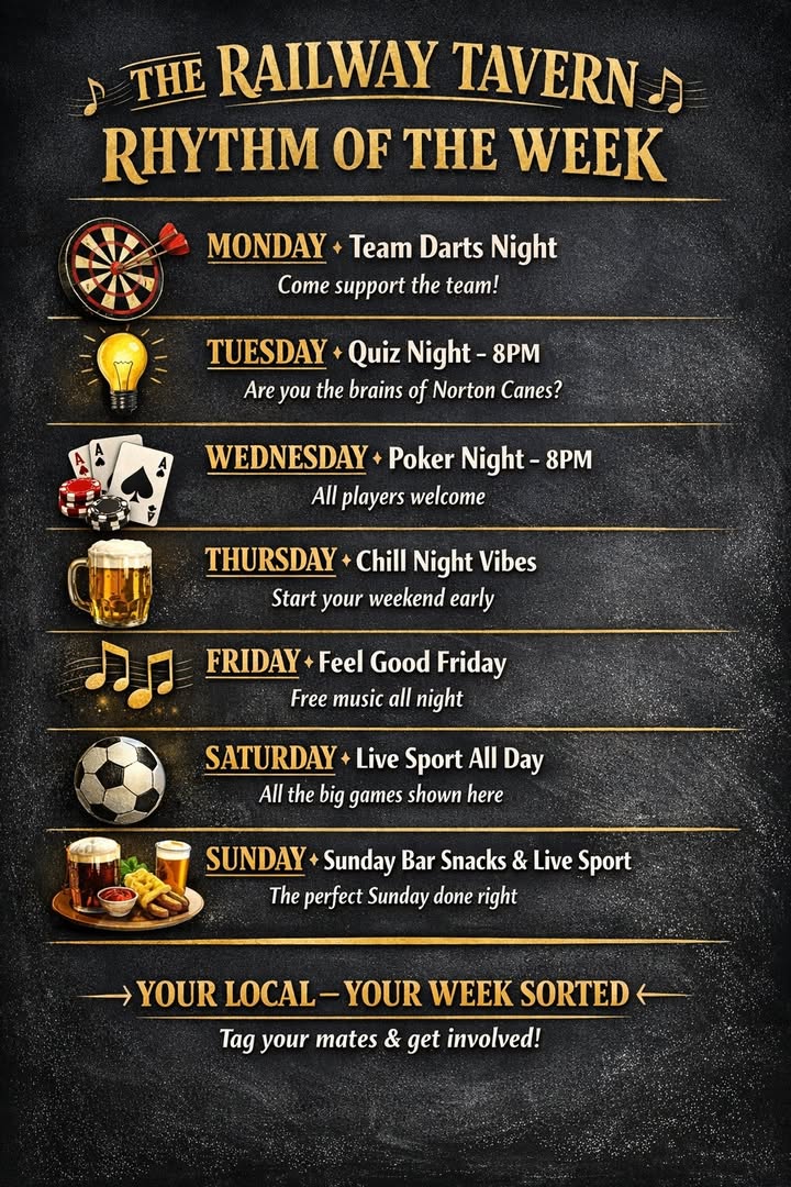 🎶 YOUR WEEK, SORTED AT THE RAILWAY TAVERN 🎶 There’s something going on every single night… 👀👇 🎯 Monday – Darts Night (come support the team!) 🧠 Tuesday – Quiz Night from 8PM ♠️ Wednesday – Poker Night from 8PM 🍻 Thursday – Chill Night Vibes 🎶 Friday – Feel Good Friday (FREE music all night!) ⚽ Saturday – Live Sport All Day 🍽 Sunday – Bar Snacks & Live Sport No excuses… your week just got BUSY 🍻🔥 📍 The Railway Tavern Tag your mates & let’s make a week of it 👇
