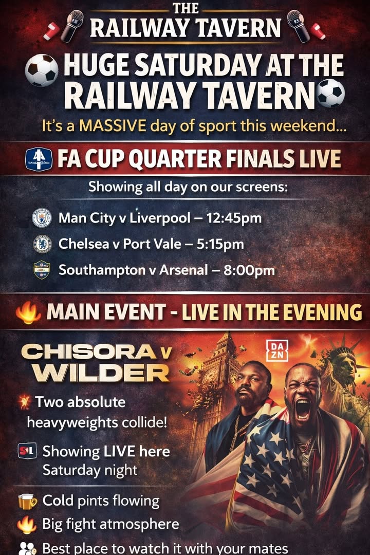 ⚽🥊 HUGE SATURDAY AT THE RAILWAY TAVERN 🥊⚽ It’s a MASSIVE day of sport this weekend… 🏆 FA CUP QUARTER FINALS LIVE 📺 Showing all day on our screens: ⚽ Man City v Liverpool – 12:45pm ⚽ Chelsea v Port Vale – 5:15pm ⚽ Southampton v Arsenal – 8:00pm 🥊 MAIN EVENT – LIVE IN THE EVENING 🔥 CHISORA v WILDER 🔥 💥 Two absolute heavyweights collide! 📺 Showing LIVE here Saturday night 🍻 Cold pints flowing 🔥 Big fight atmosphere 👥 Best place to watch it with your mates 👉 Get down early – it’s going to be BUSY!