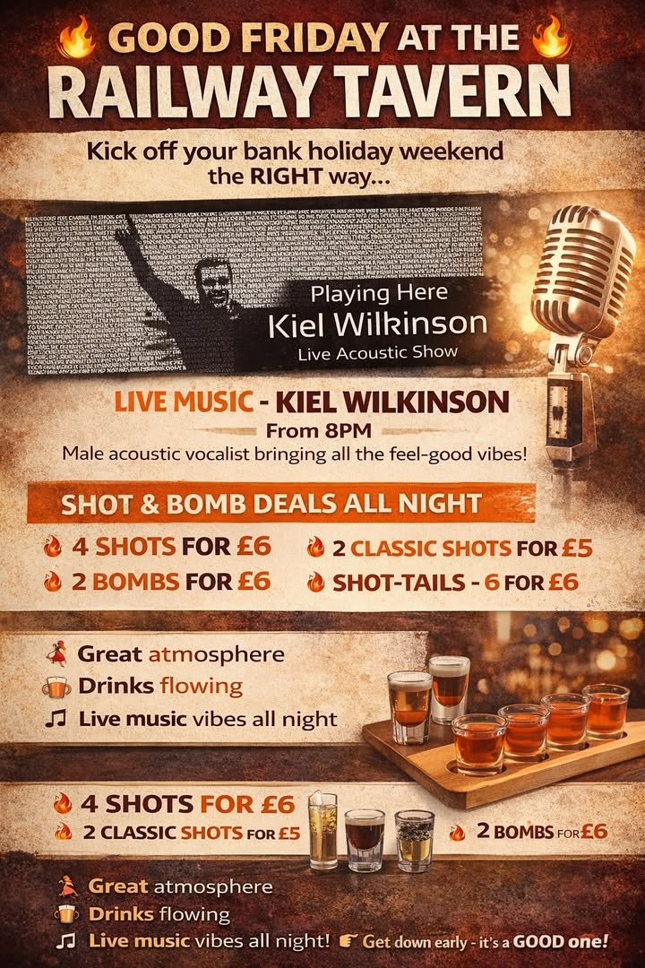 🔥 GOOD FRIDAY AT THE RAILWAY TAVERN 🔥 Kick off your bank holiday weekend the RIGHT way… 🎤 LIVE MUSIC – KIEL WILKINSON 🕗 From 8PM 🎶 Male acoustic vocalist bringing all the feel-good vibes! 🍹 SHOT & BOMB DEALS ALL NIGHT 🔥 4 SHOTS FOR £6 🔥 2 CLASSIC SHOTS FOR £5 🔥 2 BOMBS FOR £6 🔥 SHOT-TAILS – 6 FOR £6 Perfect to get the party started 🍻 💃 Great atmosphere 🍻 Drinks flowing 🎶 Live music vibes all night 👉 Get down early – it’s going to be a GOOD one!