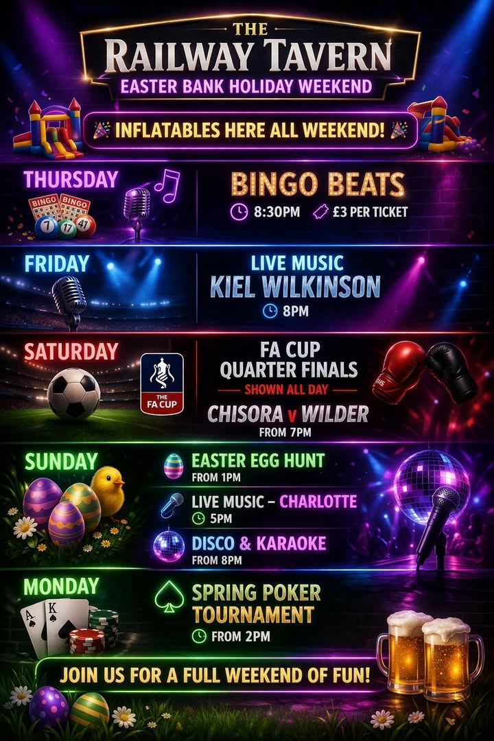 🌼 BANK HOLIDAY WEEKEND IS HERE! 🌼 We’ve got a full weekend lined up for you at The Railway Tavern 🍻 Plus inflatables here all weekend for even more family fun! THURSDAY 🎶 Bingo Beats 🕣 8:30pm 🎟 £3 per ticket FRIDAY 🎤 Male Vocalist – Kiel Wilkinson 🕗 8pm SATURDAY ⚽ FA Cup Quarter Finals shown all day 🥊 Chisora v Wilder from 7pm SUNDAY 🐣 Self-led Easter Egg Hunt from 1pm 🎤 Female Vocalist – Charlotte at 5pm 🎶 Disco & Karaoke from 8pm MONDAY ♠️ Spring Poker Tournament from 2pm Something on every day right through the bank holiday weekend — get yourselves down and join us! 🍻