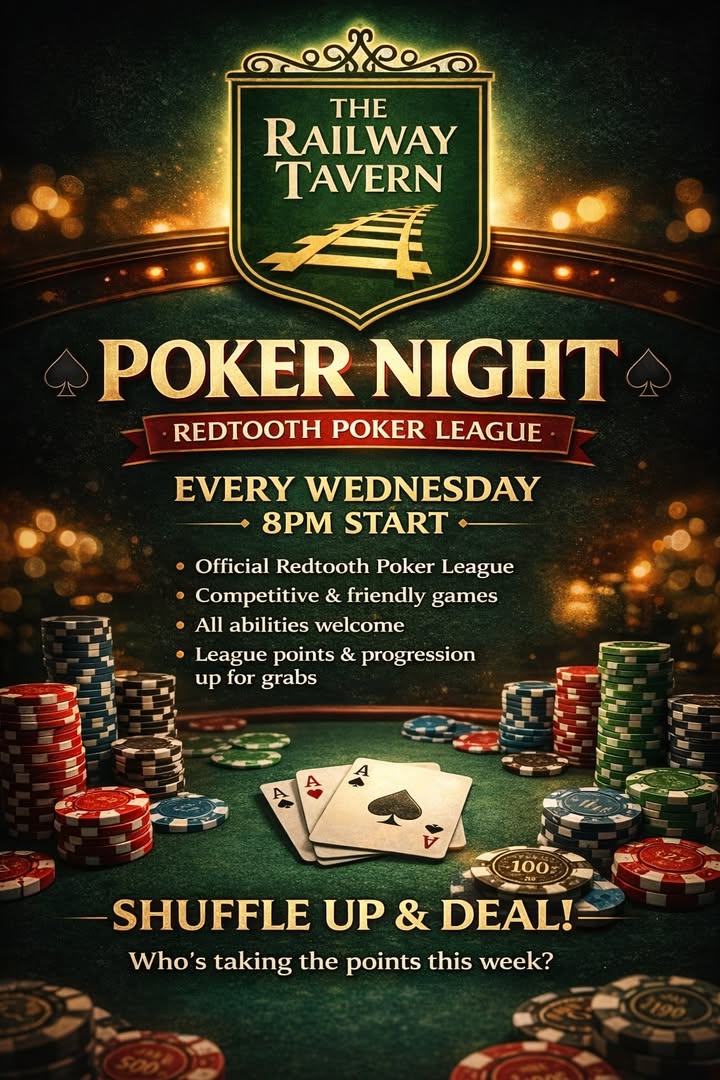 Join us tonight for ...... β οΈ POKER NIGHT β οΈ REDTOOTH POKER LEAGUE WEEK 2 β NEW PLAYERS WELCOME! π Every Wednesday β° 8PM Start π The Railway Tavern β’ Official Redtooth Poker League β’ Competitive but friendly games β’ No experience needed β’ League points & progression available Itβs not too late to join! Shuffle up & deal π‘