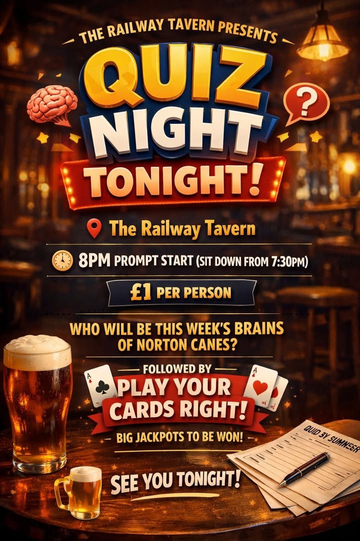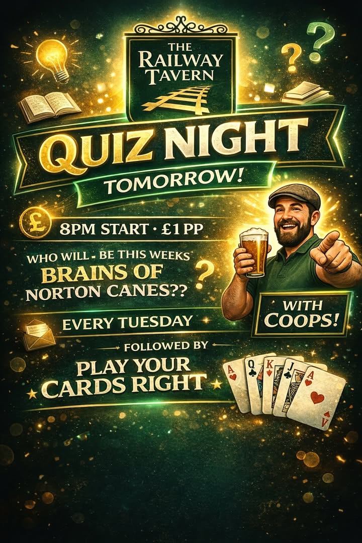 π§ QUIZ NIGHT β TOMORROW! π§ π The Railway Tavern β° 8PM START π· Β£1 per person β WHO WILL BE THIS WEEKβS BRAINS OF NORTON CANES? β π€ Hosted by Coops π Followed by Play Your Cards Right π° Big fun β’ Big laughs β’ Big prizes π Every Tuesday π’ Get in early & grab a table!