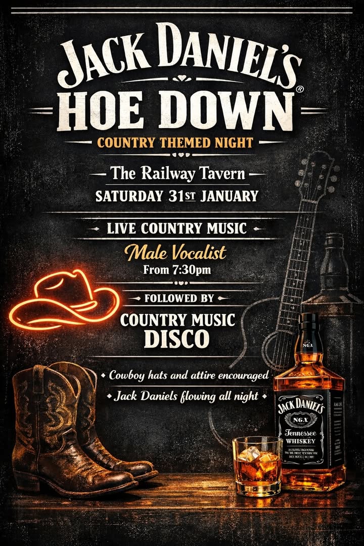 THIS SATURDAY π€ π₯ JACK DANIELS COUNTRY NIGHT π₯π€ Country vibes β’ Whiskey flowing β’ π The Railway Tavern π Saturday 31st January π€ Live country music from 7:30pm π§ Country disco till late π€ Cowboy hats & country attire encouraged π₯ Jack Daniels flowing all night Round up your crew β this oneβs gonna be a yee-haw π€ π₯